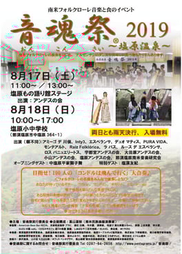そこで、「音魂祭(おんこんさい)」という音楽と食のイベントを企画いたしました。日本人にとてもなじみの深い南米フォルクローレ音楽の演奏をお楽しみいただくことはもちろん、豪快で美味しい食べ物を合わせて提供するといった、南米のスタイルを取り入れた催しとなります。開催時期も夏休み期間中ということで、地元の人々に限らず、観光で訪れた方々にも栃木県有数の温泉地、塩原温泉での夏のひとときを満喫していただければと願っております。 どうぞ、 私の大好きなフォルクローレ音楽、 私の愛する塩原でのお祭りを楽しんでください。